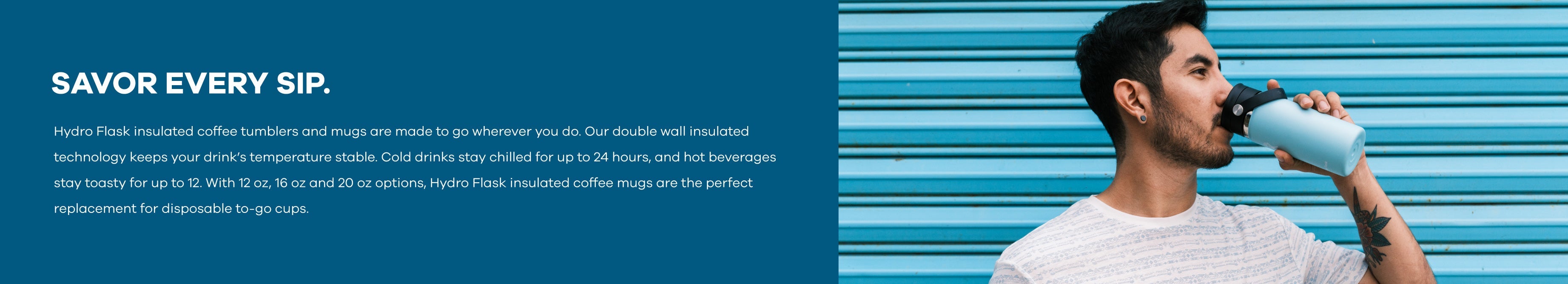 Hydro Flask insulated coffee tumblers and mugs are made to go wherever you do. Our double wall insulated technology keeps your drink’s temperature stable. Cold drinks stay chilled for up to 24 hours, and hot beverages stay toasty for up to 12. With 12 oz, 16 oz and 20 oz options, Hydro Flask insulated coffee mugs are the perfect replacement for disposable to-go cups.